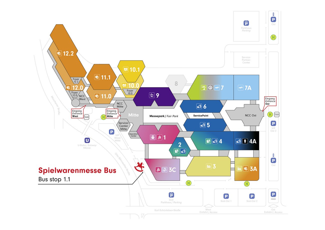After leaving the Mitte entrance, just turn left and walk past the VIP parking area; the Spielwarenmesse bus stops right at the bus stop in front of Hall 3C.