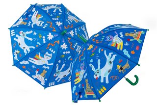 The umbrellas from Floss & Rock make walking outside in the rain even more fun. When the fabric of these umbrellas comes into contact with water, something magical happens - the white areas in the design suddenly become colored. When the fabric dries, they turn white again, and when it rains again, they become colored again. The "Color Changing Umbrellas" are available with very different motifs such as construction vehicles, pets with dogs and cats, underwater animals, dinosaurs, outer space, fantasy and more. A Velcro fastener keeps the umbrella neatly closed when not in use.