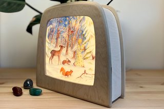 The "Magic Lamp" from Toverlux is more than just a lamp for the children's room. The pictures on the front can be changed again and again by simply sliding them in to bring a different season, a different story or a different mood into the room. Toverlux offers various illustrations by different artists. The 23x22x10 cm lamp made of birch wood has no buttons or switches - it is switched on and off by simply tapping it. The brightness can also be easily adjusted by holding it with your fingertip. The "Magic Lamp" can be placed on a table or hung on the wall. Not only is the shape soft due to the curves, but the lighting is also gentle thanks to the warm LEDs.