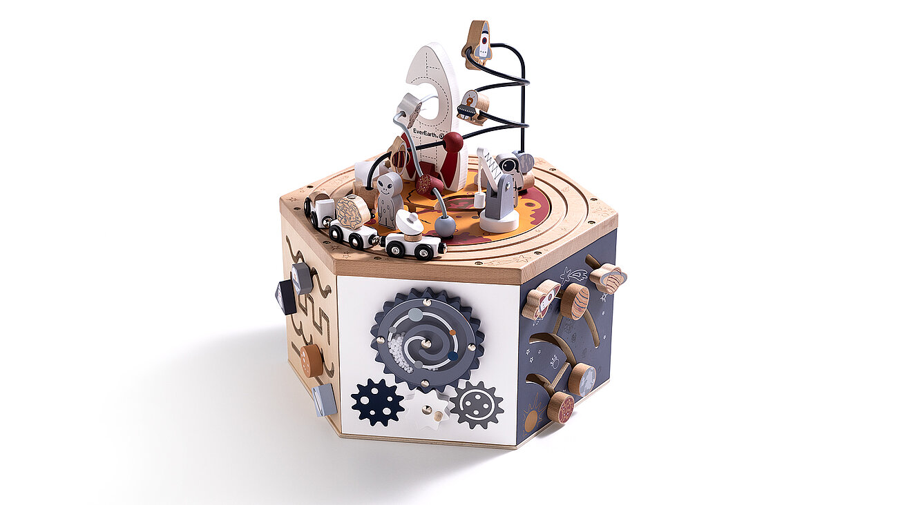 It therefore makes sense that pull and push along toys are among the most archetypal playthings. The Pull Along Drummer from Plantoys adds a twist to the classic theme. The drummer beats the drum as the child pulls the toy. Is this a form of early musical education or really a way to get parents’ nerves jangling? What’s for sure is that this toy has both pizzazz and humour. Motor activity toys are also now a fixture in children’s bedrooms. EverEarthhas produced a contemporary interpretation with its 7-in-1 Astronaut Activity Cube, which serves as a shape sorter as well as a space station with planets, vehicles and alien figures. This innovation picked up the Toy Award in the Baby & Infant category.