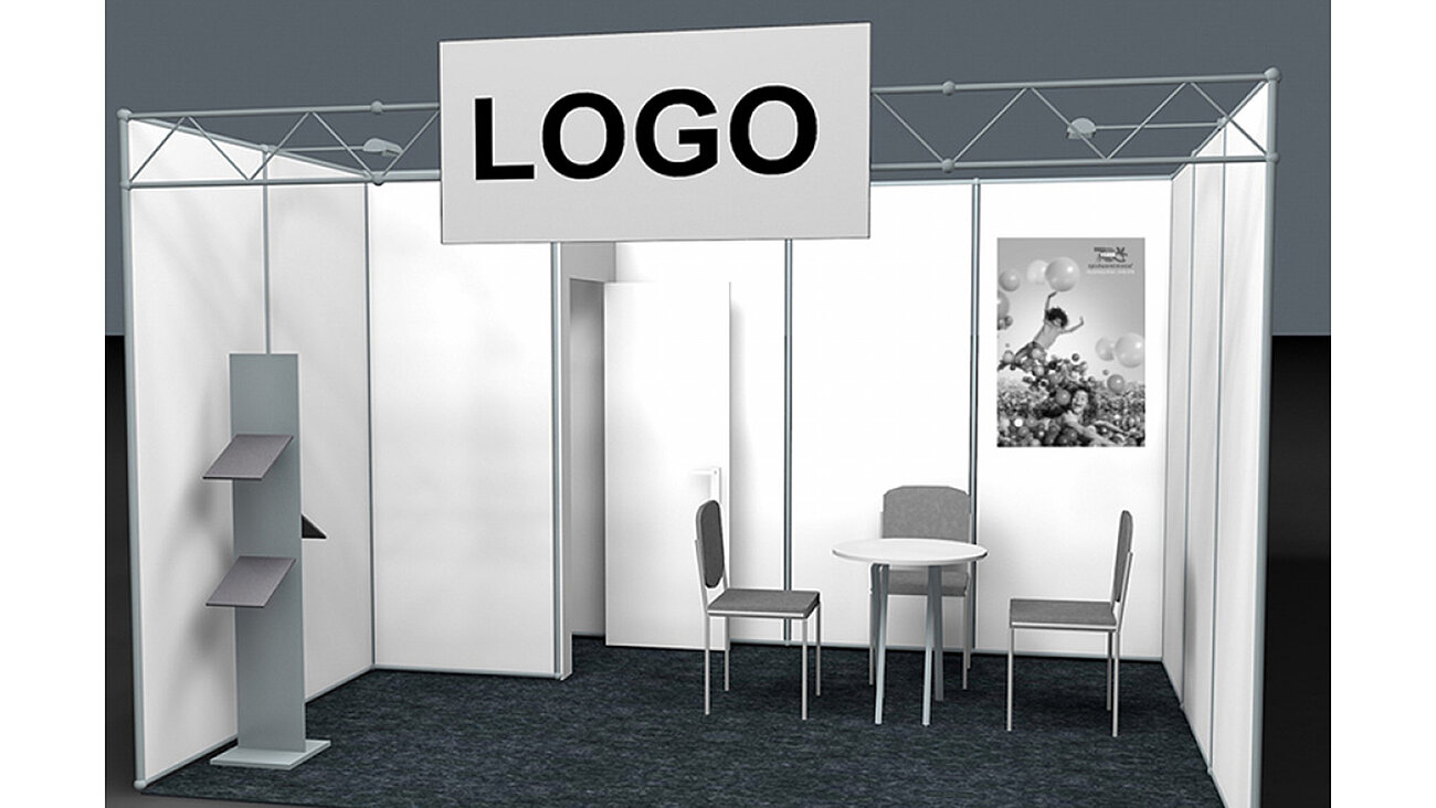 - High-quality stand construction incl. 1x1 m storage room and anthracite carpet (Messebau Wörnlein GmbH)