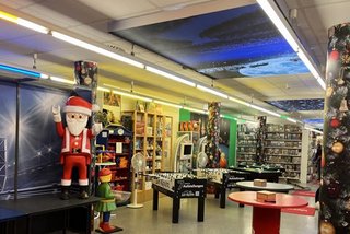 Die letzte freie Fläche, die letzte Werbe-Bastion im Spielwaren-Ladengeschäft findet sich unter der Decke. „Wir haben alles optimiert: niedrigere Regale, bessere Musik, angenehme Düfte“, zählt Heinz Lehmann auf. Alles für ein einziges Ziel: „Im Einzelhandel musst Du Emotionen wecken, Gefühle verkaufen – nur so kannst du Menschen dazu bewegen, zu dir zu kommen, nur so den Umsatz steigern.“ Und so kam Lehmann, seit Jahrzehnten Spielzeugladenbesitzer im Frühjahr 2022 auf die zündende Idee, als er in einem trendigen Bäder-Geschäft einen magisch leuchtenden Whirlpool entdeckte. „Die graue, triste Decke muss weg“, dachte er und gesagt, geschafft (er ist ja gebürtiger Schwabe, die tun nicht, die schaffen) –hat er ein visuelles Konzept entwickelt.