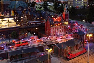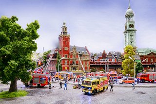 Großalarm in der Hamburger Speicherstadt: Es brennt! Rund 30 Löschfahrzeuge, Drehleitern, Einsatzleitwagen und andere Feuerwehrautos rücken mit blitzenden Blaulichtern aus. Zum Glück ist es kein echter Einsatz, sondern eine Simulation im Maßstab 1:87 in der Stadt „Knuffingen“, dem Herzstück des Miniatur Wunderlandes. „Die Neugier kleiner und großer Besucher auf die Einsatzfahrten ist dennoch riesengroß“, sagt Axel Dirks. Er ist Teamleiter für das Car System im Miniatur-Wunderland. „Insgesamt 55 Feuerwehrfahrzeuge nach Vorbildern aus verschiedenen Ländern sind auf der ständig wachsenden Anlage unterwegs“, erklärt Dirks – ein gutes Dutzend davon im USA-Abschnitt.