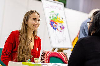Ich bin an einem Plakat hängengeblieben, das mit Farbklecksen und dem Schriftzug „Schmierfink“ für Aufmerksamkeit sorgte. Kaum hatte ich mir einen freien Sitzplatz erobert, erklärte Sarai Aporta ihre Spielidee, die sie mit ihrem Vater entwickelt hatte. Thematisch wird bei „Schmierfink“ gänzlich Neues versucht. Es geht darum, hingekritzelte Doppelbegriffe zu entziffern. Als i-Tüpfelchen muss jeder selbst ein zusammengesetztes Wort in Schmierfink-Manier hinkrakeln. Andere Spieler sollten es nicht ohne Weiteres entschlüsseln können. Diese feine Idee hat auch Redakteure auf den Plan gerufen. Gleich mehrere sind bei ihr vorstellig geworden und haben Interesse signalisiert. Frau Aporta war gut vorbereitet und konnte allen Nachfragenden die Spielregel mitgeben und erhofft, dass ein Spielemuster von einem Redakteur angefordert wird.