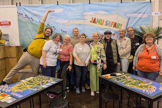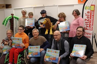 Vereinschefin Zeller denkt Inklusion bis zum Ende. Der Verein lädt zu seinen regelmäßigen Spielerunden Jung und Alt ein. „Versierte Strategen sind genauso willkommen wie Gelegenheitsspieler oder Neugierige“, betont die hauptberufliche Buchhalterin. Bei ihrem Vereinsfundes mit über 1.000 Spielen fällt ihr allerdings mal auf: „Es gibt wenig coole Spiele für Menschen mit Behinderung.“ So kommt sie auf die Idee, ein Gesellschaftsspiel mit Menschen zu entwickeln, die selbst mit körperlichen Beeinträchtigungen oder Lernschwierigkeiten leben. Vier Frauen und ein Mann im Alter von 18 bis 60 Jahren tüfteln ausdauernd an ihrer Idee. Dass sich die Spieleentwickler selbst ihr Thema raussuchen können, waren sie überhaupt nicht gewohnt, erinnert sich die Dettingerin. So bekommt das Spiel den Titel „Jahu Safari – Zwei Tierwelten – gemeinsam sind wir stark“. Es entsteht in den Workshoprunden ein Säckchen, aus dem die Zutaten für die Party gezogen werden. „Das war der beste Workshop ever“, schwärmt Zeller noch heute. Andere zeichnen Tiere, die dann als Spielfiguren realisiert werden. Der letzte gestalterische Schliff kommt vom Künstler Achim Potempa. „Die Menschen mit Behinderung waren die Macher, das war für die Beteiligten das Spannendste.“ Seit 2023 gibt es das fertige Spiel mit einer Erstauflage von 1.000 Exemplaren.