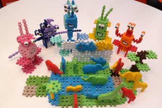 Bewusst weicher und flexibler sind die Steckelemente von Marioinex aus Polen. Sie bestehen aus flachen sehr unterschiedlich geformten Waffel-Bausteinen mit quadratischen Löchern und Zapfen zur individuellen Steck-Verzahnung. Je nach Zielgruppenalter haben diese eine Quadratloch-Größe und Zapfenlänge von 7,5 mm (Midi-Waffle), 5 mm (Mini-Waffle) oder 2,5 mm (Micro-Waffle). Die am meisten verbreiteten Mini-Waffles sind überwiegend für Kinder von drei bis sechs Jahren gedacht. Als Neuheit wurden hier unter anderem Themen-Sets aus 50 oder 100 Teilen mit einfach geformten Tieren unter den Mottos Safari und Savanne vorgestellt. Als Mitbringsel-Geschenke oder einfach nur zum Sammeln gedacht sind 24 Pocket Pets, die meist aus 20 bis 30 Teilen bestehen. Daneben gibt es die Crazy Monsters in zwei Sets aus 60 bzw. 148 Steckelementen für drei bzw. fünf bunte Fantasiewesen.