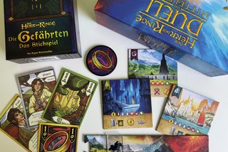DHdR Die Gefährten – Das Stichspiel (von Office Dog ) sucht einen anderen Weg. In einem kooperativen Stichspiel gehen die Protagonisten die Aufgabe an. Rollen mit unterschiedlichen Charaktereigenschaften werden verteilt, um eine Mission zu erfüllen. In 18 Kapiteln müssen neue und zunehmend anspruchsvollere Aufgaben beim Stichgerangel bewältigt werden. Der Ringträger hat dabei stets einen verführerischen Vorteil. Die Illustrationen erinnern an Glasmalereien. Das gibt dem Spiel einen eigenen Charakter und grenzt sich von anderen Mittelerde-Darstellungen wohltuend ab.