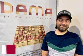 Dame auf Arabisch. Das Dame-Spiel ist in vielen Erdregionen ein Klassiker. Auf der arabischen Halbinsel wird es gerne auf Straßen und Plätzen gespielt, indem die beiden Kontrahenten ein 8x8-Felderraster auf den Boden ritzen und mit Steinchen als Setzfiguren losspielen. Bei Dama von Abdulrahman Al-Homaid hat der Verlag Majlis Shabab aus Katar eine Version mit polierten Holzfiguren etabliert. Ähnlich wie bei „Dame“ gilt es auch hier, eigene Figuren auf die gegnerische Grundlinie zu ziehen und sie dort mit einer Krone aufzuwerten. Jetzt kann in alle Richtungen beliebig weit gezogen und geschlagen werden. Allerdings, die singuläre Startaufstellung provoziert Gegnerkontakt von Anfang an.