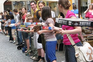 Zweimal wurde die Ludothek seit der Vereinsgründung umgesiedelt. Der Umzug von der Herrengasse zu den jetzigen Vereinsräumlichkeiten war speziell, ein spektakuläre Gemeinschaftsleistung. Mit Hilfe von Schulklassen wurde eine lange Menschenkette von der Herrengasse über die Sporgasse bis zum Karmeliterplatz gebildet und die Spiele durch die Stadt von Mensch zu Mensch weitergereicht. Ein schönes Bild, dass auch sinnbildlich für den Vereinszweck steht: Menschen durch Spiele zusammenbringen.