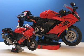 Am Messestand von Double Eagle Industry war diesmal zwar kein echter AMG-Rennwagen als Eyecatcher und auch sonst kein Fahrzeug in 1:1 ausgestellt, aber die zahlreichen sportlichen Klemmbausteine-Handmuster der Marke CaDA konnten sich ebenfalls sehen lassen. Fans von Motorädern dürfte die Jubiläums-Edition der Suzuki Hayabusa freuen. Sie hat im Maßstab 1:6 eine Länge von 336 mm und besteht aus 1043 Teilen. Wer nicht so viel Platz im Regal hat, kann diese Maschine in 1:12 aus 299 Teilen bauen. Für Formel 1-Freunde war ebenfalls einiges geboten. So kommt der Formel 1-Rennwagen des BWT Alpine-Teams in der blau-pink-farbenen Version der Saison 2025. Bereits das aus 300 Teilen bestehende Modell in 1:24 hat eine stattliche Länge von 262 mm. Dank austauschbarer entsprechend bedruckten Teilen kann es wahlweise für Pierre Gasly oder Franco Colapinto als Fahrer in Szene gesetzt werden. In der Version für Erwachsene kommt der offiziell bei Alpine lizenzierte A525 auch in 1:8 aus 2173 Teilen mit einer imposanten Länge von 71 cm.