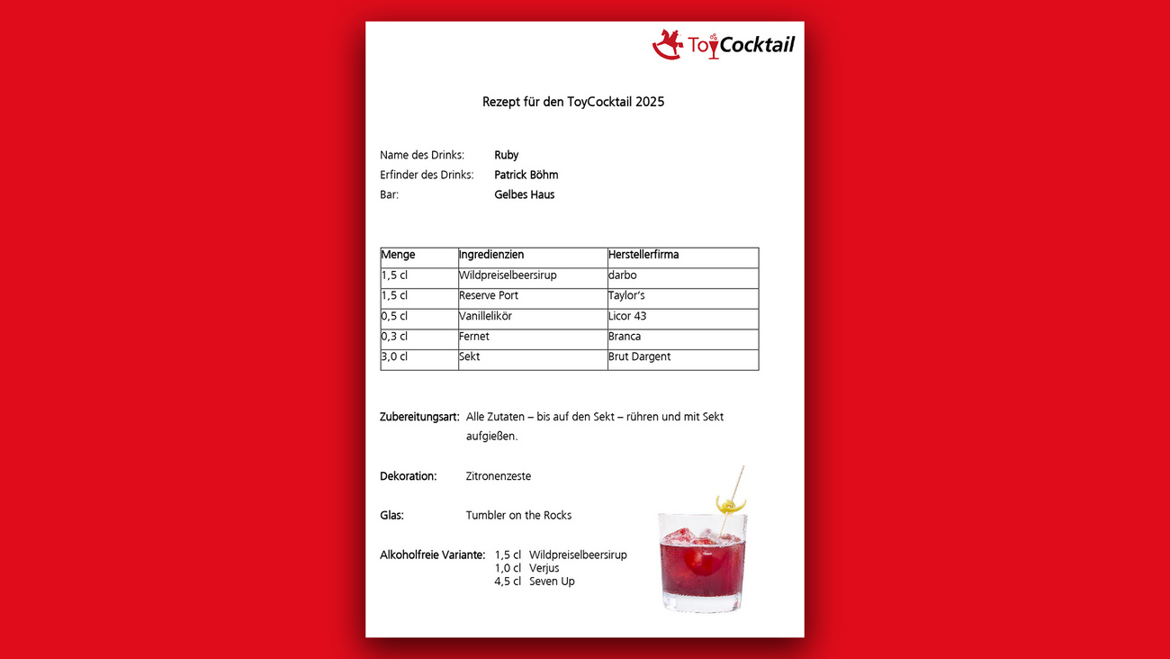 Der Spielwarenmesse ToyCocktail 2025 heißt „Ruby“ und kommt aus der Bar Gelbes Haus. Bei dem Wettbewerb am 25. November, der im Herrengedeck in Nürnberg vom Vorjahressieger ausgerichtet wurde, sind sechs Barkeeperinnen und Barkeeper aus der Metropolregion angetreten. Es wurde um die Wette gemixt, geschüttelt und gerührt – Patrick Böhm erhielt von der Jury die höchste Punktzahl. Silber ging an das Herrengedeck, den dritten Platz belegte TREFF im Arvena Park Hotel.